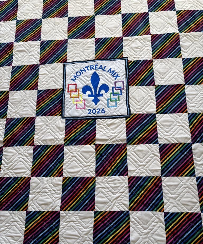 We are raffling off a beautiful lap quilt that was hand-made by Elise Robichaud (mom of committee member JM) just for us. Featuring bold rainbow designs, it includes the Montréal Mix 2026 logo prominently in the center.